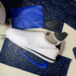 The Nike Cortez Basic Shoe is an updated version of Bill Bowerman's 1972 running classic which we diconstructed and rebuilt with Navy & Royal genuine leather. The Middle, Toe, and Back showcase JVL's stamped deboss pattern leather while the Heel, Swoosh, and Lace Guard make use of our Top Grain Royal Leather.